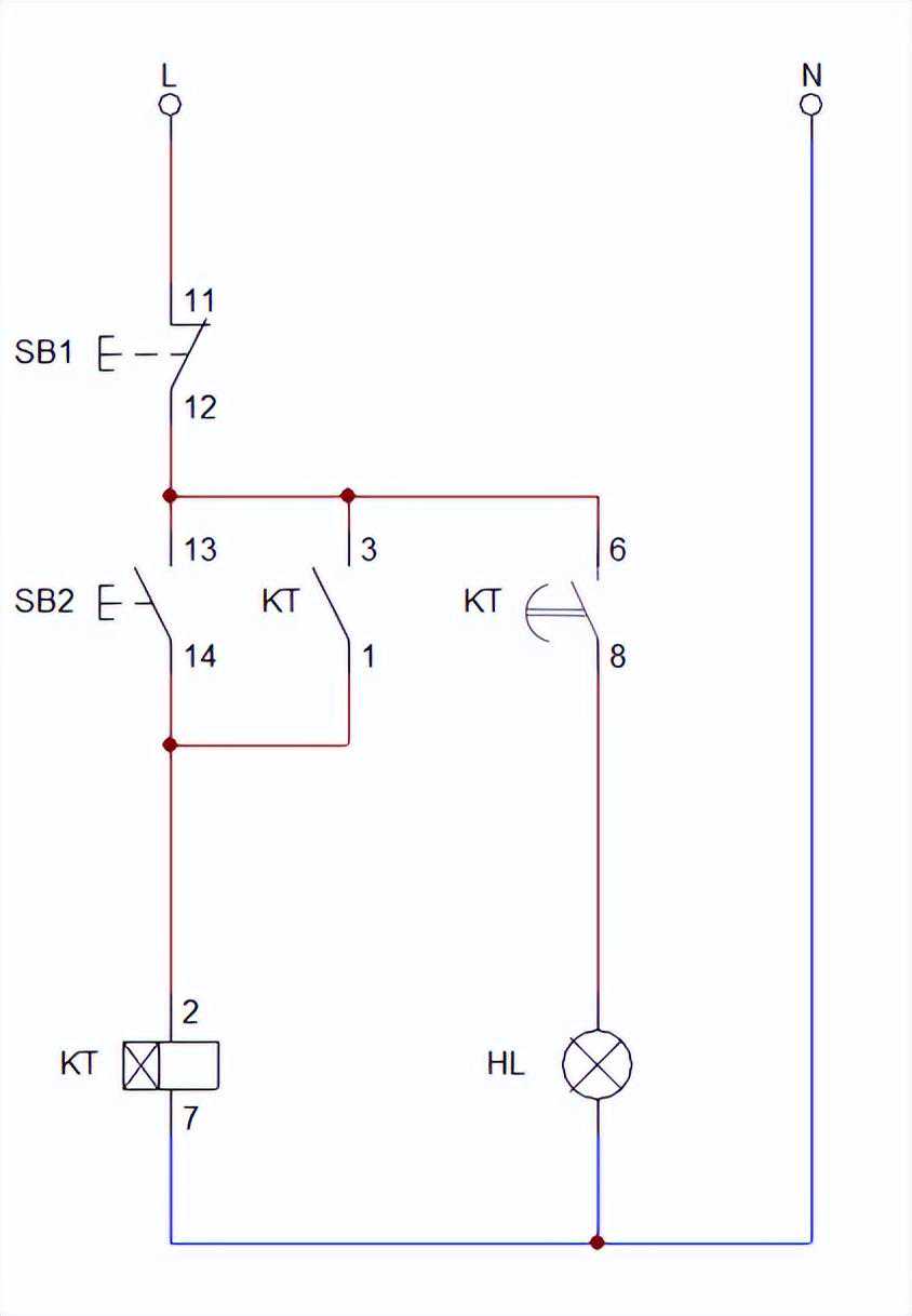 小案例:一起來看一下這個電路,原理分析:合閘送電,按下啟動按鈕SB2,時間繼電器線圈得電,自身的瞬時常開觸點1-3立即閉合,松開SB2,時間繼電器通過閉合的1-3持續給線圈供電形成自鎖。到達設定時間,延時閉合觸點6-8閉合,指示燈發光,按下停止按鈕SB1,指示燈熄滅。