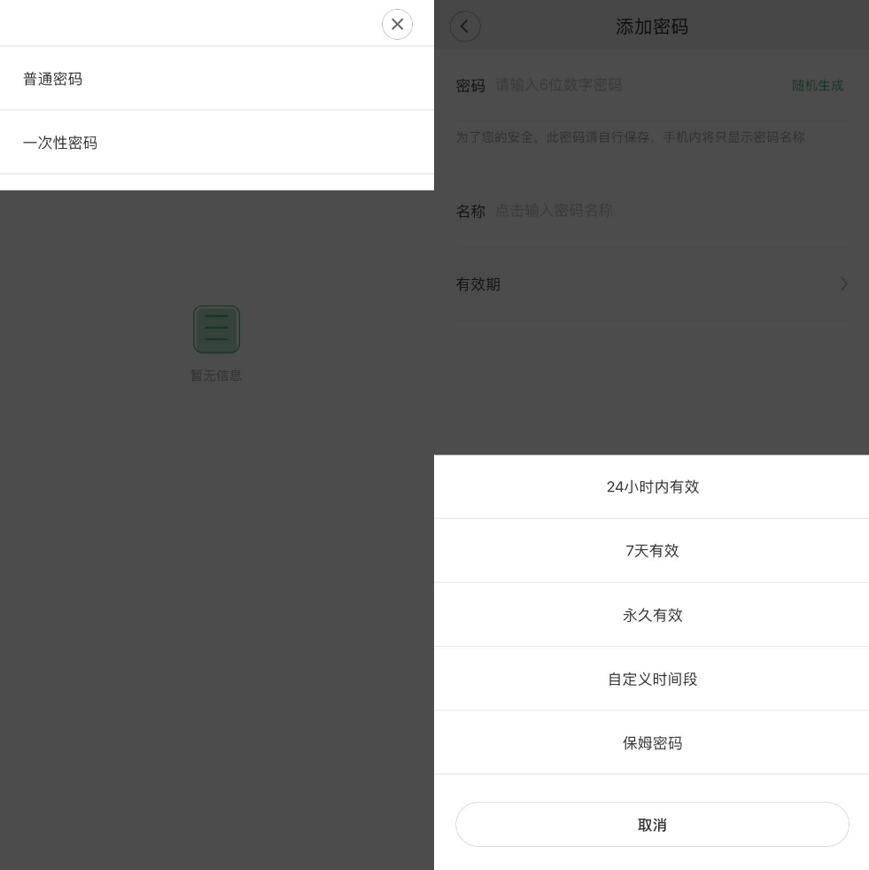 另一種為一次性密碼,一次性密碼有幾種使用限制,如半小時后自動失效、使用一次后自動失效。這個功能對請朋友到家中做客,但主人暫時沒回到家而朋友提前到了的場景比較有用。初次使用需要在靠近門鎖連接藍牙時開啟該功能。