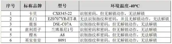 經測試,在-20℃低溫和40℃高溫的環境下,所有門鎖均可正常工作。而在-40℃低溫的環境下,有6個品牌的門鎖樣品出現問題。