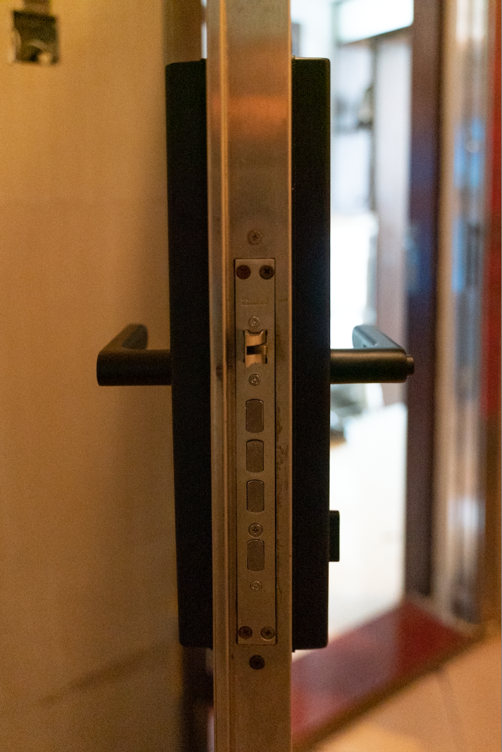 最下方則為機械反鎖按鈕,在通過機械反鎖之后,外面無法直接打開門鎖。