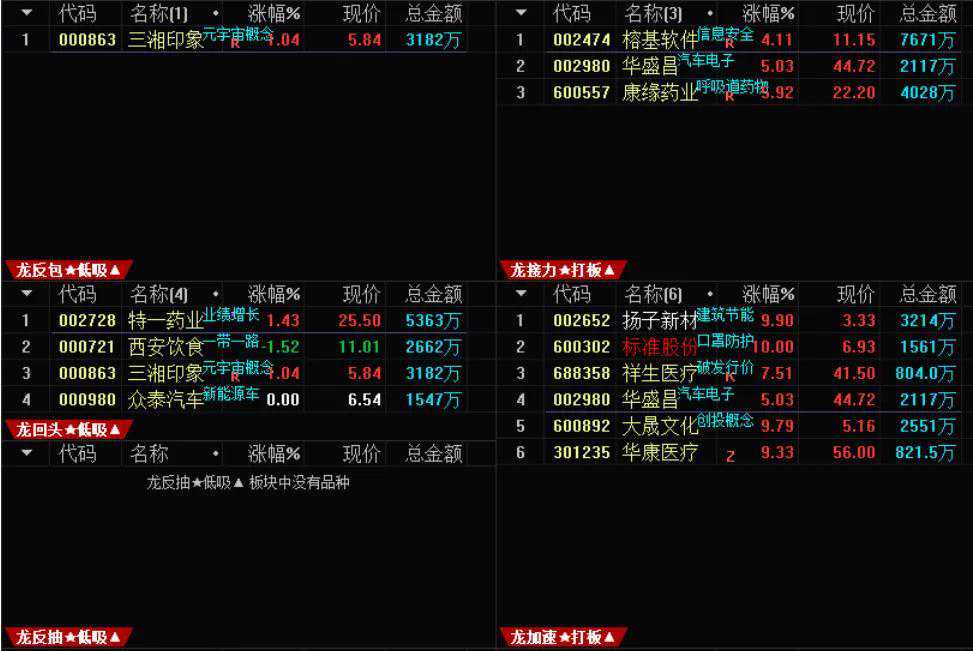 低吸區,龍反包,三湘印象,前期漲幅為連續一字板籌碼,不符合條件預設,剔除。龍回頭,特一藥業,醫藥板塊當前屬于熱點,中軍龍頭眾生藥業,空間龍頭神奇制藥,特一為補漲龍,前期非一字板漲幅,昨日有利好刺激,符合條件預設,西安飲食,多次出現,莊股,剔除。眾泰汽車,非當前熱點,剔除。