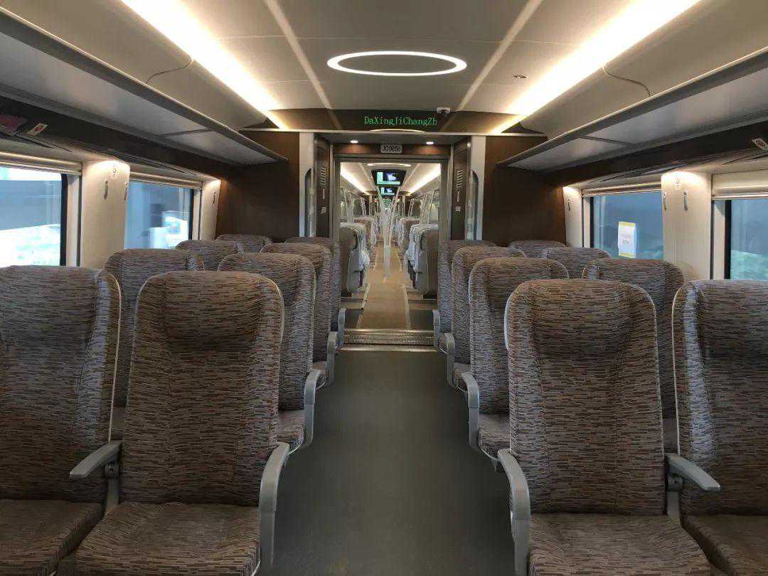 列車編組充分對標航空,采用載客車廂+行李車廂設(shè)置的“7+1”形式,載客車廂分為普通車廂+商務(wù)車廂形式,內(nèi)設(shè)全座席。普通車廂座椅采用“2+2”布置、商務(wù)車廂采用“2+1”布置,座椅尺寸和間距超過復(fù)興號高鐵動車組二等座和一等座要求,整體內(nèi)飾色調(diào)對標復(fù)興號。同時,車內(nèi)設(shè)置差異化行李架、LED隱藏光源、環(huán)形裝飾燈帶、USB充電口等設(shè)施,人性化設(shè)計,提升乘坐環(huán)境。