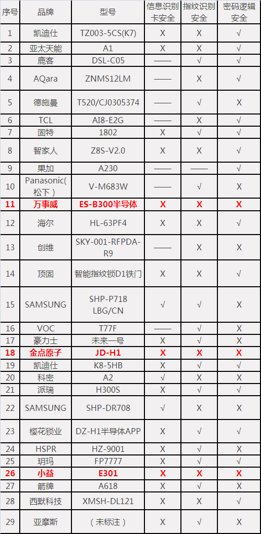 南都記者發(fā)現(xiàn),萬事威(標(biāo)稱型號:ES-B300半導(dǎo)體)、金點原子(標(biāo)稱型號:JD-H1)、小益(標(biāo)稱型號:E301)等三款智能門鎖樣品,在密碼開啟、指紋識別、信息識別卡三種開啟方式上,均存在安全隱患。