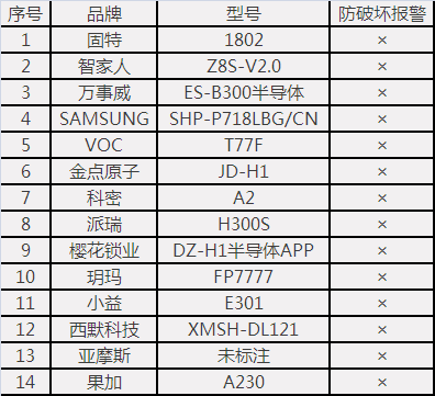 SAMSUNG(標(biāo)稱型號:SHP-P718LBG/CN)、櫻花鎖業(yè)(標(biāo)稱型號:DZ-H1半導(dǎo)體APP)、果加(標(biāo)稱型號:A230)等14款鎖,在連續(xù)實施誤操作及防護面遭受外力破壞時,無法發(fā)出聲或光報警指示或報警信號。