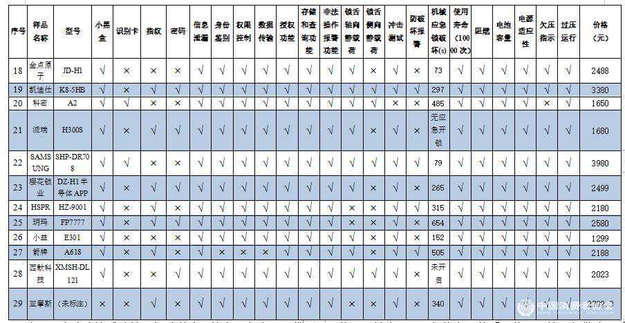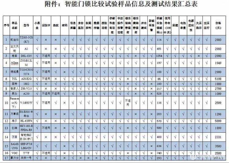 附件:智能門鎖比較試驗樣品信息及測試結(jié)果匯總表
